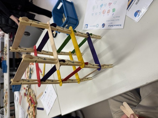 Für die Klassen 5 bis 7 fand im Hauptgebäude eine große Science-Rallye statt, bei der Entdecken und Ausprobieren im Mittelpunkt standen. An verschiedenen Stationen konnten naturwissenschaftliche Phänomene erforscht und Aufgaben gelöst werden, unter anderem der Bau von Brücken nach einer Vorlage von Leonardo da Vinci aus Holzstäbchen. Besonders motivierend war der Wettkampfcharakter: Die jeweils beste Klasse pro Jahrgangsstufe gewann 250 Euro für die Klassenkasse. Über diese Preise durften sich die Klassen 5a, 6d und 7a freuen. Betreut wurde die Rallye von engagierten Schülerinnen und Schülern der Oberstufe, die ihr Wissen weitergaben und die jüngeren Teilnehmenden unterstützten.